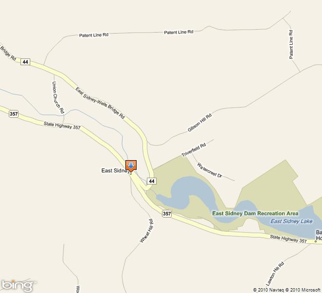 Location: East Sidney Dam is located on Ouleout Creek in Delaware County, N.Y. The dam is approximately four highway miles downstream from the village of Franklin and six miles upstream from Unadilla. Route 357 Town of Sidney, New York 13838.